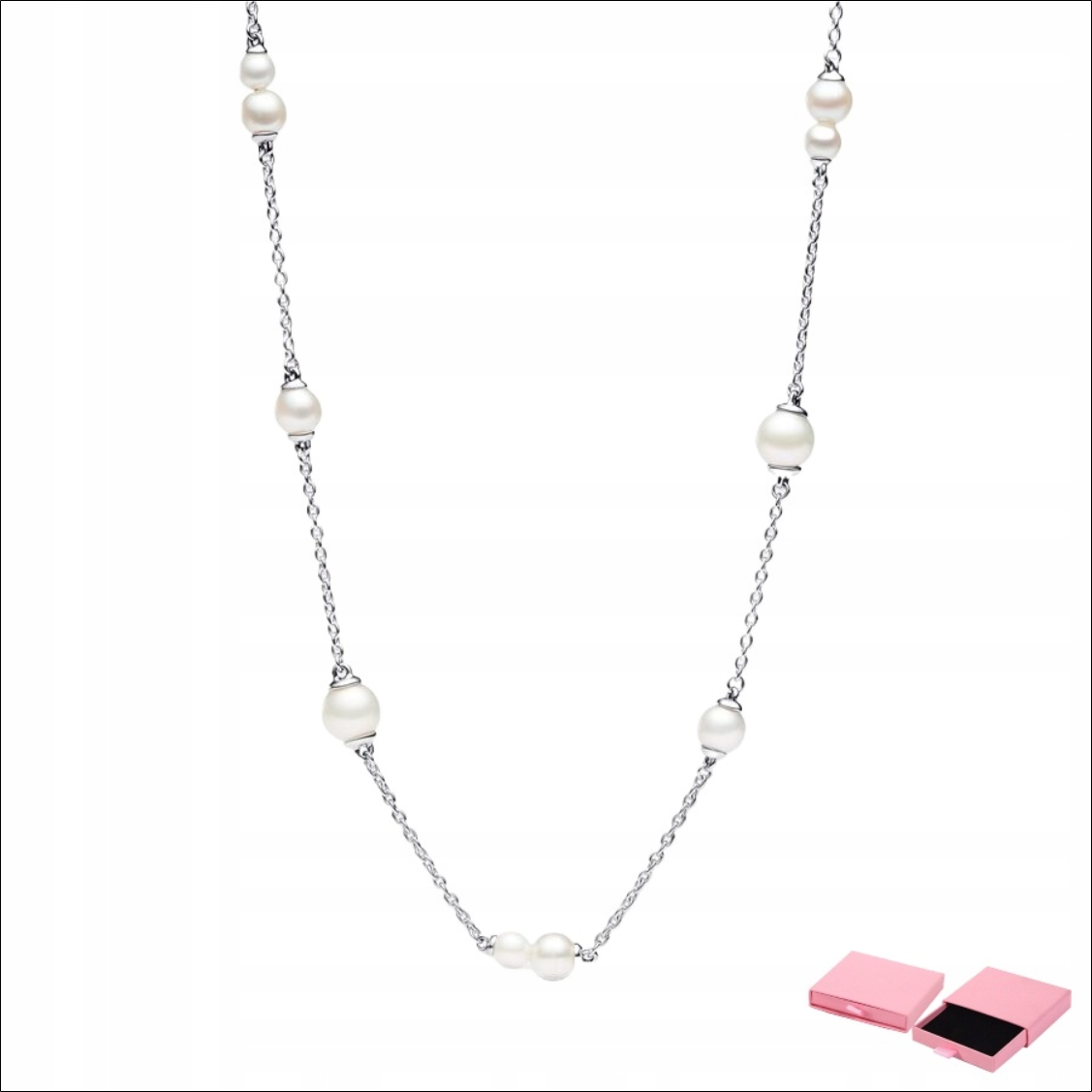 Reach for the Freshwater Cultured Pearl Chain Necklace and shine like there’s no tomorrow. This sterling silver necklace features 13 white freshwater cultured pearls, each one unique and beautiful. The 45 cm chain is adjustable to 42 cm and 38 cm to match the rest of your outfit. Whether you’re using this pearl necklace as a symbol of wisdom, beauty or love, it’s a great gift for someone special or a stylish addition to your collection. Please note that each freshwater cultured pearl is unique and may vary in size and colour; signs of normal wear and tear may occur over time. Our freshwater cultured pearls are bleached and treated to enhance their shine.