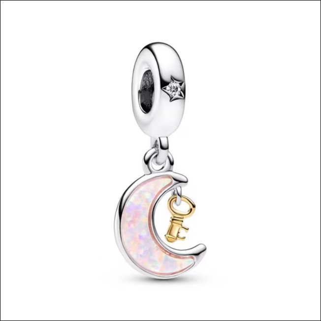 Charm pendant from PANDORA. It is made of 925 silver and only the key attached to the tip of the crescent moon is made of a gold-plated metal alloy.