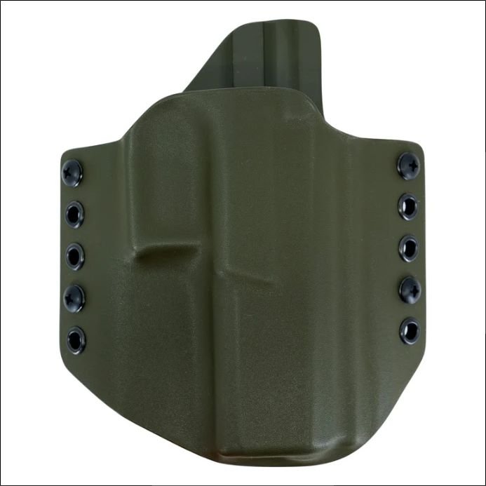 The OWB CZ P-10 F holster by RH Holsters® is crafted from high-quality 2mm Kydex, ensuring durability and a precise fit for the CZ P-10 F pistol. The half SweatGuard design effectively separates the weapon from the body and clothing, providing protection against sweat while maintaining comfort during movement. The holster features sharp, detailed molding that replicates the contours of the firearm, ensuring a secure fit and easy reholstering. It offers adjustable retention, allowing users to customize the draw tension to their preference. The belt attachment is facilitated by steel SpeedLoops, which can accommodate belts up to 40mm in width and 8mm in thickness, ensuring a secure and stable carry. The holster’s open design allows for easy cleaning and accommodates firearms with extended barrels, threaded barrels, compensators, or collimator sights. This holster is suitable for both right-handed and left-handed users and is ideal for all-day concealed carry. It is manufactured in the Czech Republic.